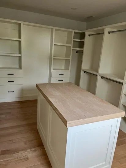 This project involved the creation of a custom walk-in closet carpentry system designed to efficiently organize the space. Additionally, the installation features built-in shelving, multiple drawer units, hanging sections, and a central island with a wood top. Moreover, the layout was coordinated to ensure consistent spacing, clean lines, and functional storage throughout the room.